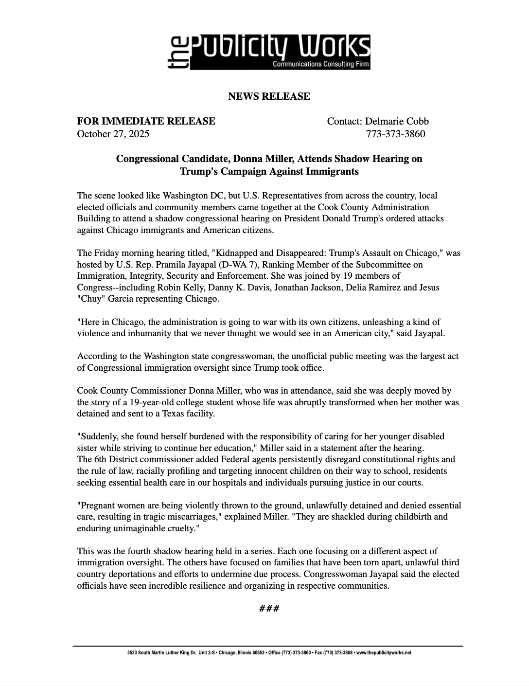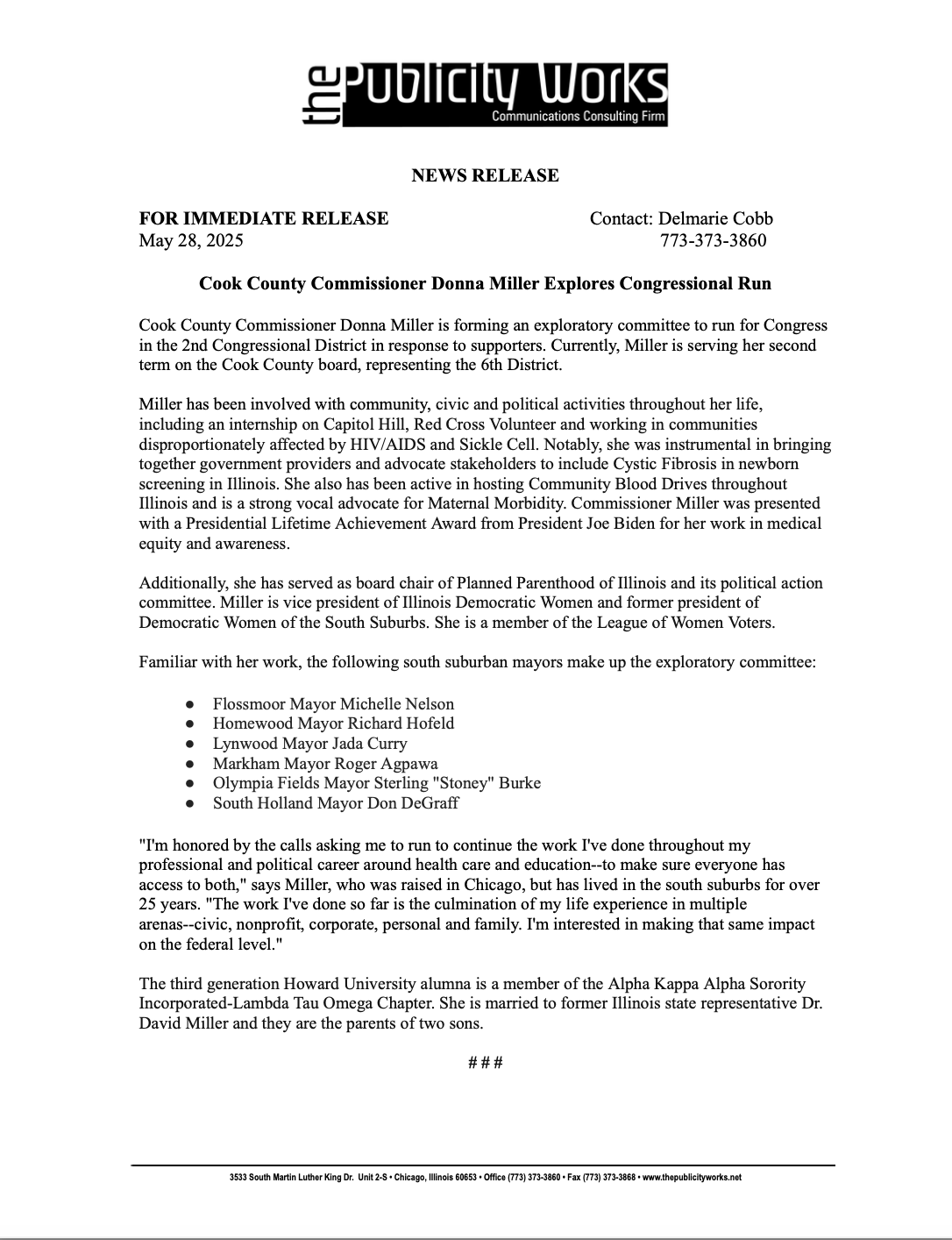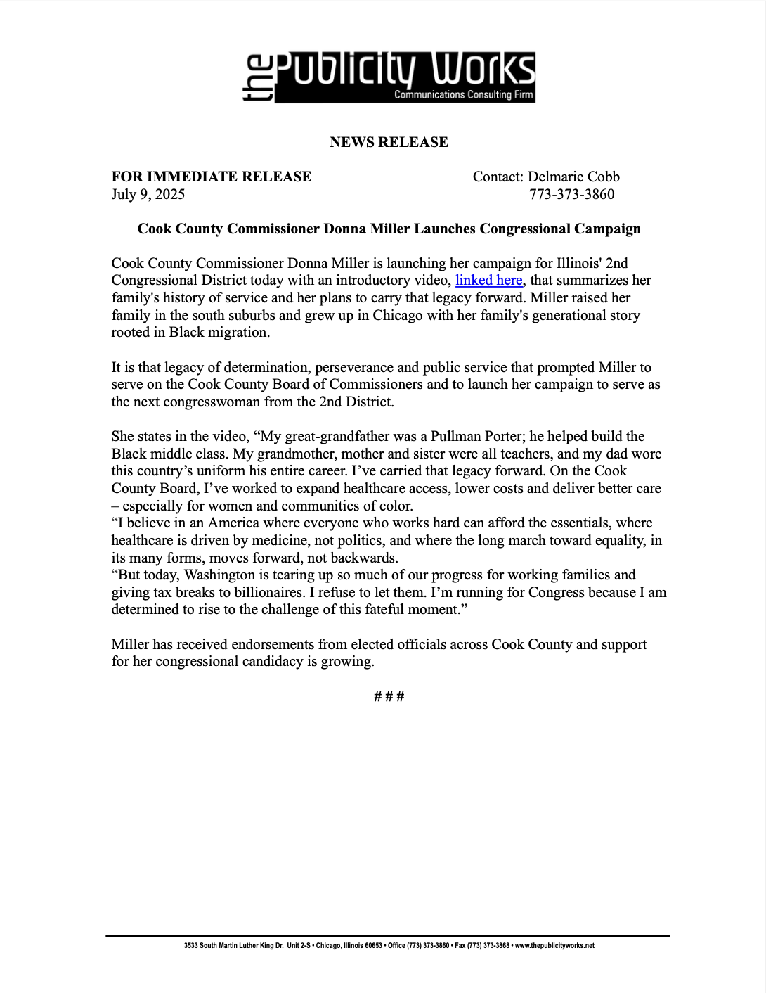 Cook County Commissioner Donna Miller launched her campaign this week for Illinois’ 2nd Congressional District, releasing a video that ties her run to her family’s legacy of service and her work in county government…