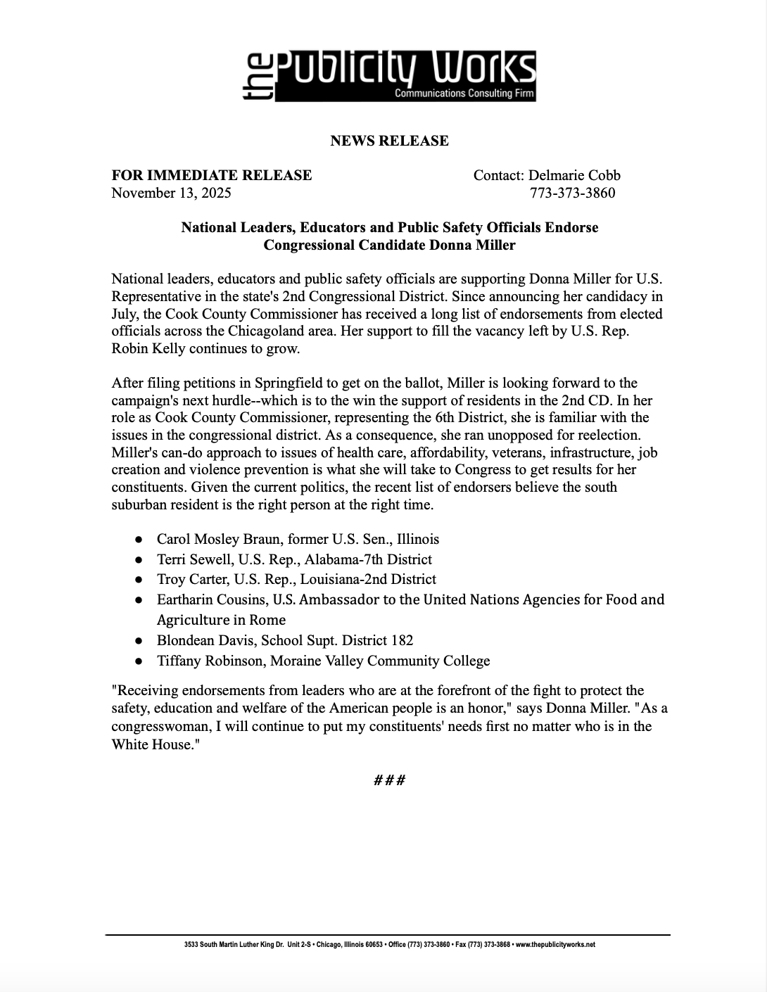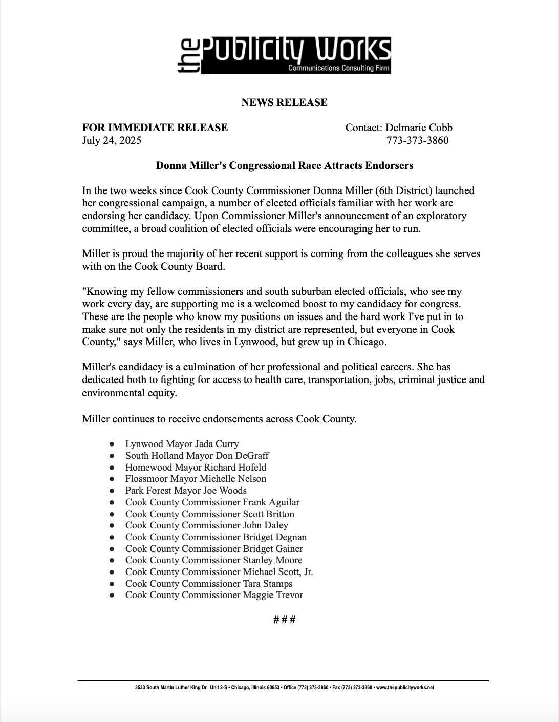 In the two weeks since Cook County Commissioner Donna Miller (6th District) launched her congressional campaign, a number of elected officials familiar with her work are endorsing her candidacy. Upon Commissioner Miller's announcement of an exploratory committee, a broad coalition of elected officials were encouraging her to run…